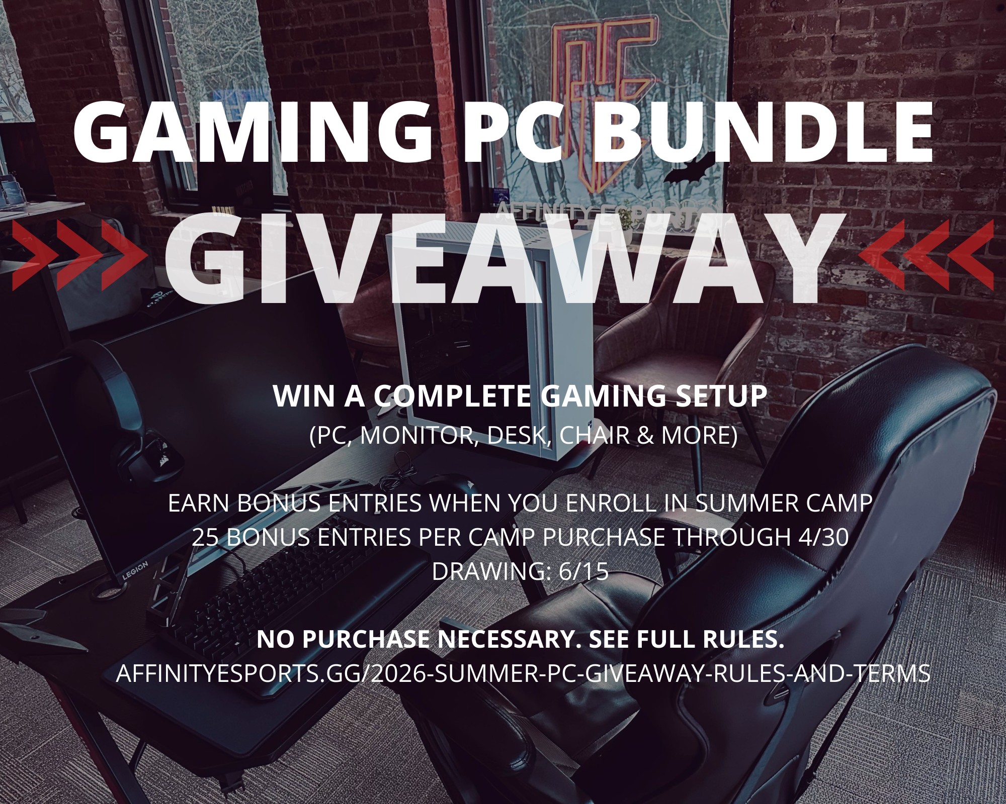 No purchase necessary. Enter for free, email hello@affinityesports.gg with the subject “Free PC Giveaway Entry” and include your name, email, and phone number (limit one entry per person).